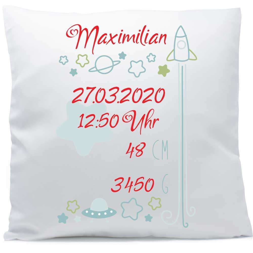Kissen mit Namen Geburt Geburtsanzeige Rakete Ufo Stern Planet 40x40 cm inkl. Füllung